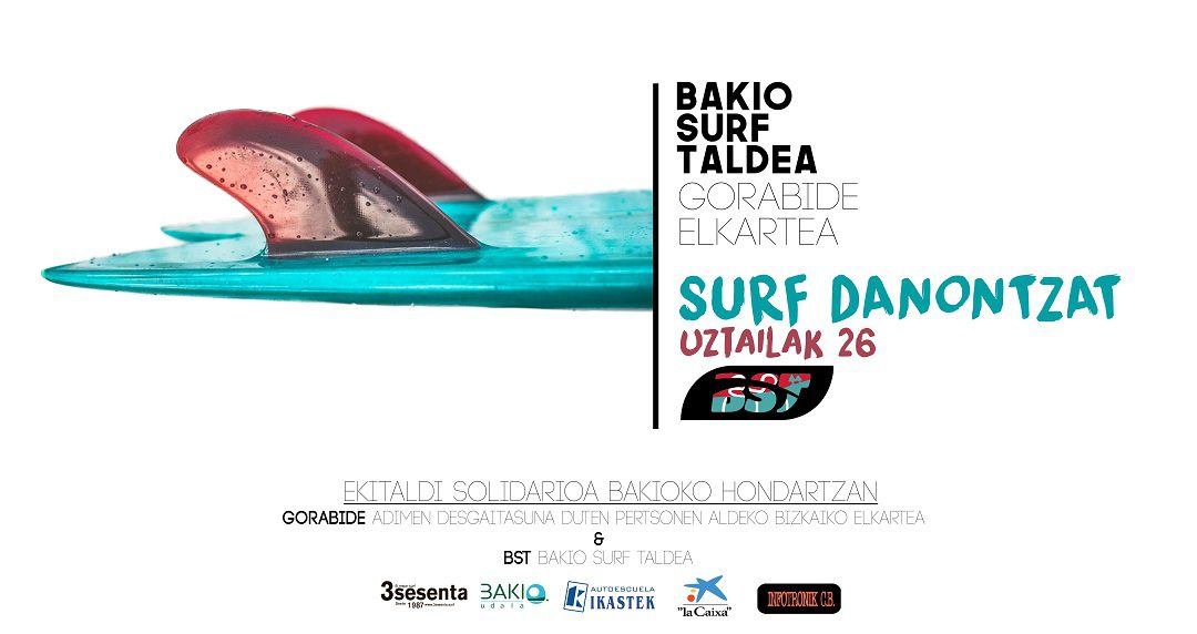 Surf Denontzat con Gorabide Mungia. El próximo miércoles 26 de julio por la mañana el BST recibe a un grupo de chavales de Gorabide Mungia, asociación para personas con discapacidad intelectual. Una veintena de chavales que vienen con toda la ilusión a pasar una jornada divertida de surf con los chic@s de la eskola del Bakio Surf Taldea y voluntarios del club.